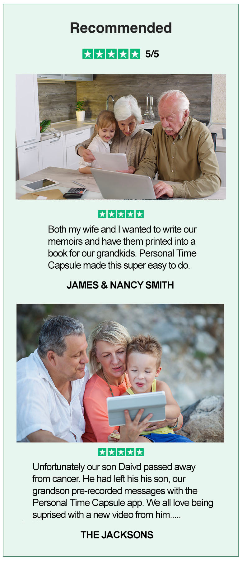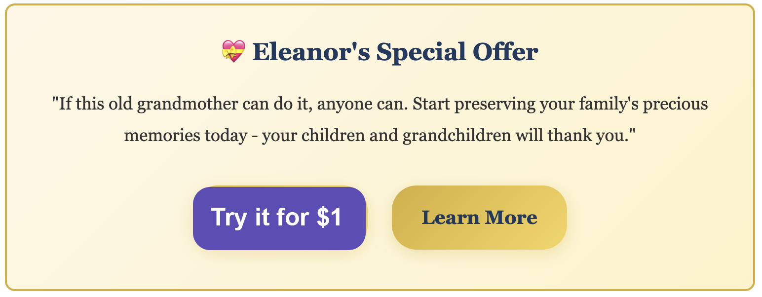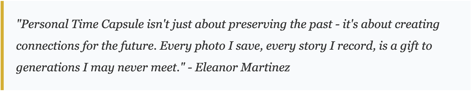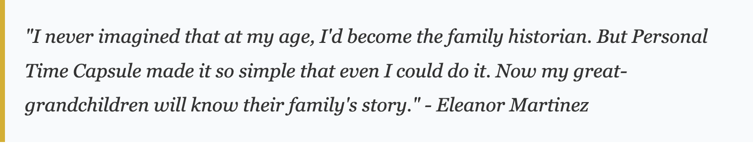 Personal Time Capsule has recently added Estate Planning which ads another dimension to Eleanor's legacy planning. She's now working on creating not just a digital memory collection, but also ensuring her legal affairs are in order. "It's comforting to know that everything is organized and my family will have both the memories and the legal documents they need," she says. She was able to easily create her last will and testament from the comfort of her own couch.